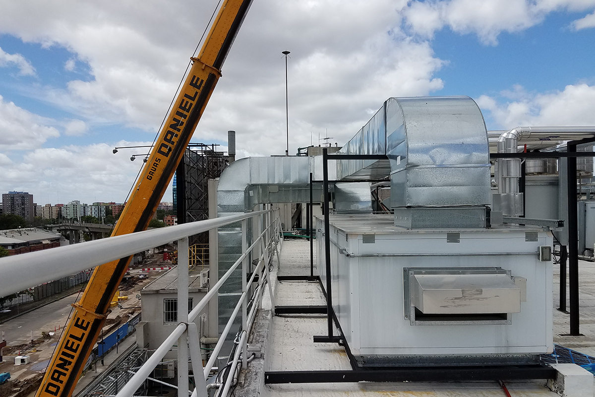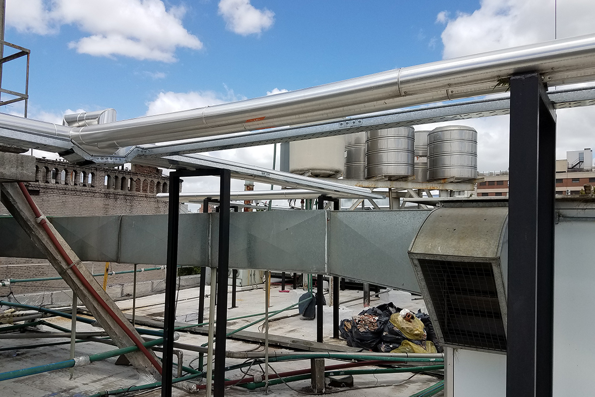Los condicionamientos desafiantes del proyecto, se concentraban en los espacios físicos reducidos tanto para las instalaciones dentro como fuera del sector. El recorrido de los conductos a lo largo de una medianera lateral, tuvo que ser efectuada a través de una estructura tubular paralela, que garantizara sobre todo la seguridad de las personas durante su instalación. Dentro del local, la altura y la limitación del espacio requirieron de un diseño particular de la distribución de los elementos terminales para cubrir tanto los requerimientos normativos como la condición de confort de los ocupantes durante la operación del reactor.