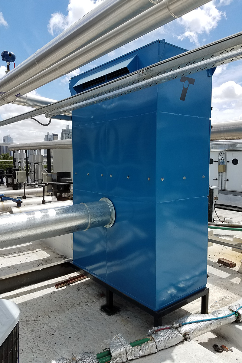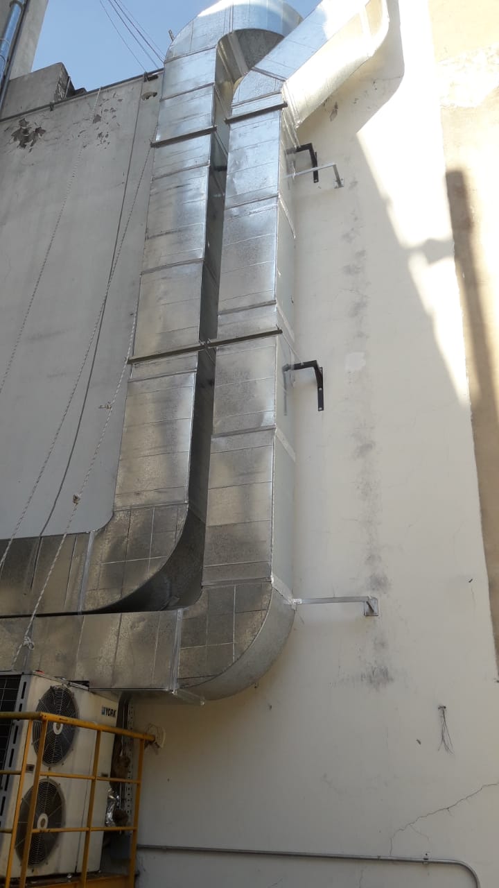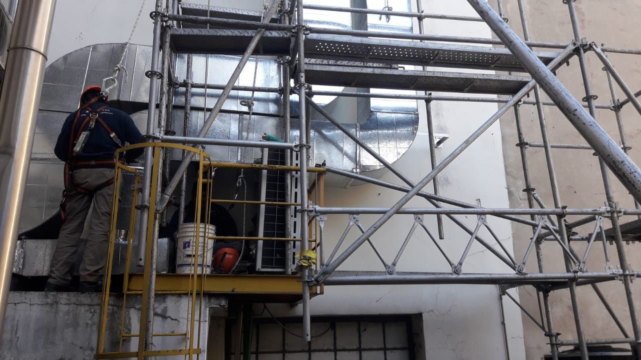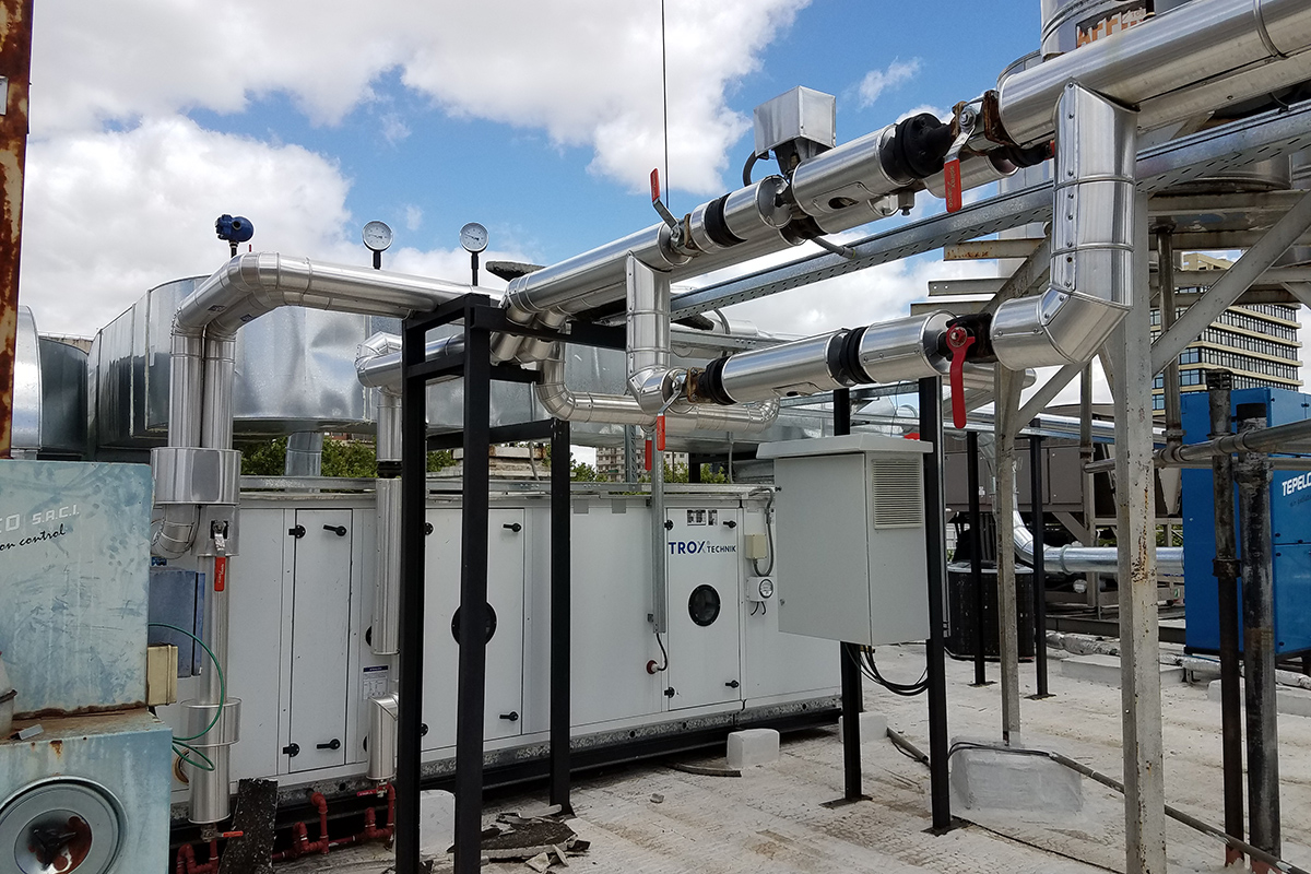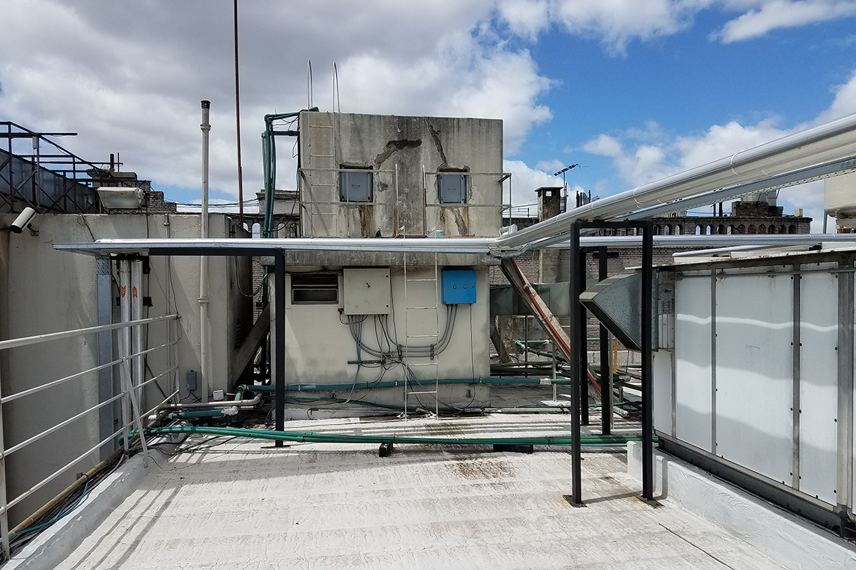 Los condicionamientos desafiantes del proyecto, se concentraban en los espacios físicos reducidos tanto para las instalaciones dentro como fuera del sector. El recorrido de los conductos a lo largo de una medianera lateral, tuvo que ser efectuada a través de una estructura tubular paralela, que garantizara sobre todo la seguridad de las personas durante su instalación. Dentro del local, la altura y la limitación del espacio requirieron de un diseño particular de la distribución de los elementos terminales para cubrir tanto los requerimientos normativos como la condición de confort de los ocupantes durante la operación del reactor.