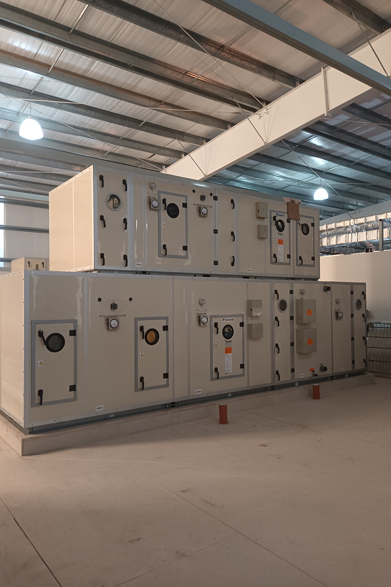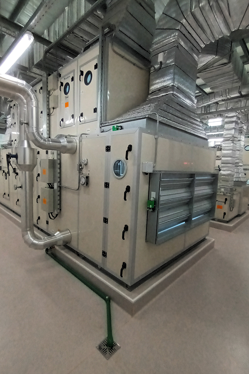 El proyecto incluye dos zonas de producción separadas según su exposición al producto, incluyendo sistemas 100% aire exterior, con un total de 8 manejadoras de aire, un equipo de aspiración de polvos, una planta de agua fría con capacidad de 120 Tr. y expandible a 160 Tr., tableros eléctricos de potencia y controles con controladores programables y pantalla touch de frontera.